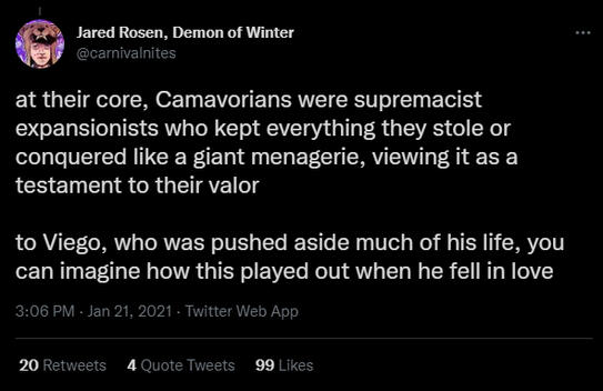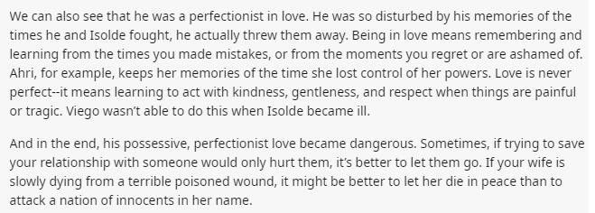 Parker says that Viego was a perfectionist in love, and he did throw away the memories of their fights. However, they also state that Viego did not learn from his mistakes and continued to do awful things in the name of love. Parker also says that being in love means "remembering and learning from the times you made mistakes" and "Viego wasn't able to do this when Isolde became ill."In clear words, Parker says Viego's love became possessive and even dangerous. "Sometimes, if trying to save your relationship with someone would only hurt them, it's better to let them go." Viego clearly should have let her die in peace, but instead, he attacked a nation of innocent people. Rowan Parker clearly confirms that their relationship was not happy or healthy, and actually hurt Isolde.At the end of their response, Parker states that they "don’t think it’s wrong to fantasize about or write fanfic about what it could have been like if Viego and Isolde’s relationship had been better." Obviously, this is true as people are allowed to ship and enjoy whatever they please, but it isn't always a good thing either. This part of the response is what I believe to be the copium that people are overdosing on, still trying to justify their canonical relationship. The last straw they're grasping for to say viesolde is healthy, despite Parker directly confirming it wasn't.