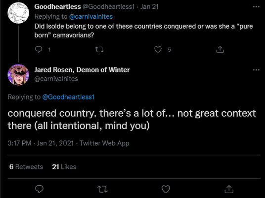 In the same Twitter thread, Rosen confirms that Isolde is from a country conquered by Camavor. Even mentioning that there is a lot of "not great" context, which is left intentional. [x]