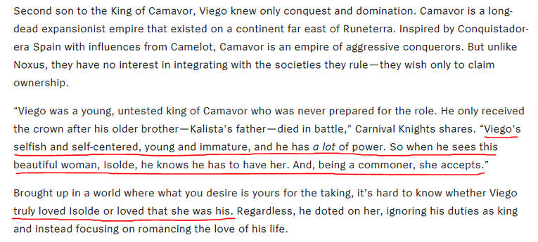 Author of the article, Erika Haas (AKA Riot Cashmiir), even states that "it's hard to know whether Viego truly loved Isolde, or loved that she was his." I personally believe it is the latter, seeing Isolde only as yet another thing he can conquer and own.