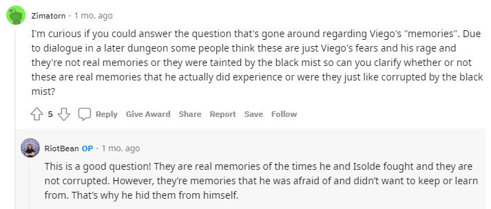 Of course, many questions emerged from those who played the game and saw Viego's memories. Sure enough, Riot gave some interesting answers.Below are excerpts from a Reddit post that creative director Rowan Parker (AKA Riot Bean) had made to answer questions about Viego and Isolde's relationship. [x]